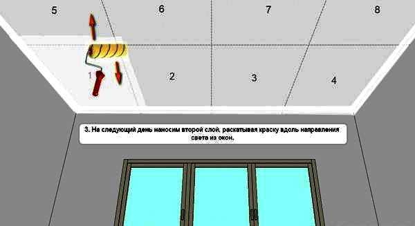 - Делим мысленно потолок на небольшие участки, удаленные от мастера на длину руки. Окрашиваем разметку сначала продольными, а затем поперечными движениями.
