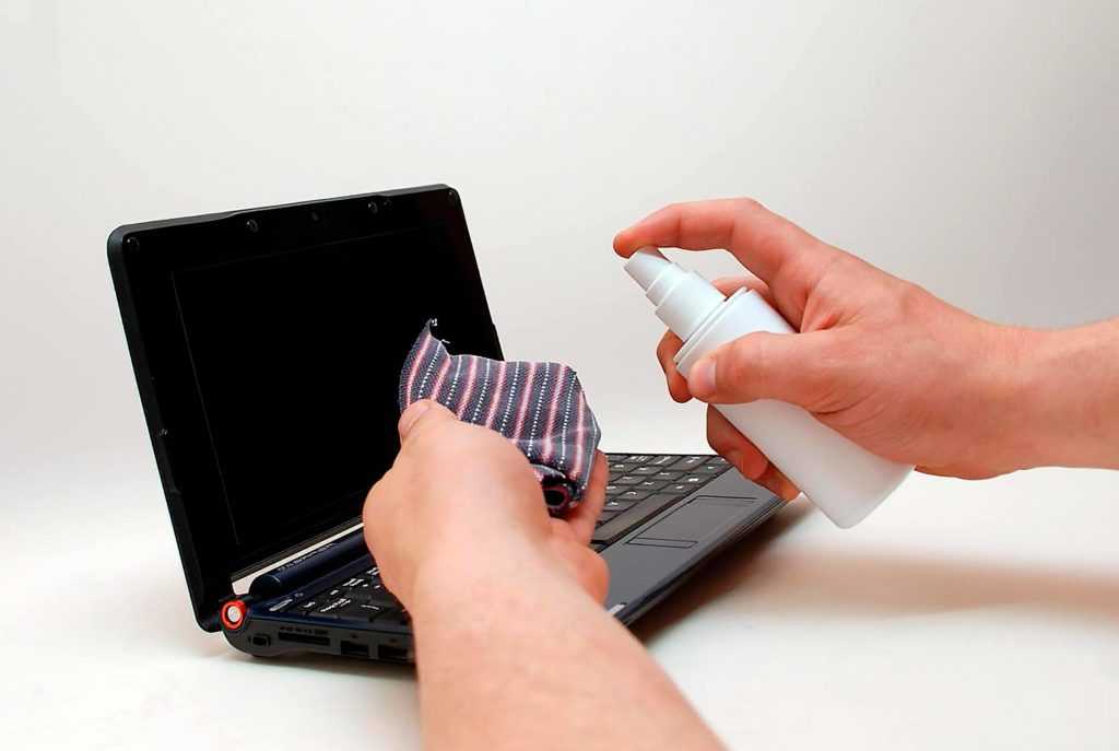 Для ноутбуков используют такие же средства. Но надо следить, чтобы мыльная вода не попала на клавиатуру. При выполнении процедуры монитор рекомендуется максимально наклонить экраном вниз. И сильно на влажную тряпку нажимать не стоит — можно продавить поверхность и придется оплачивать ремонт оборудования.