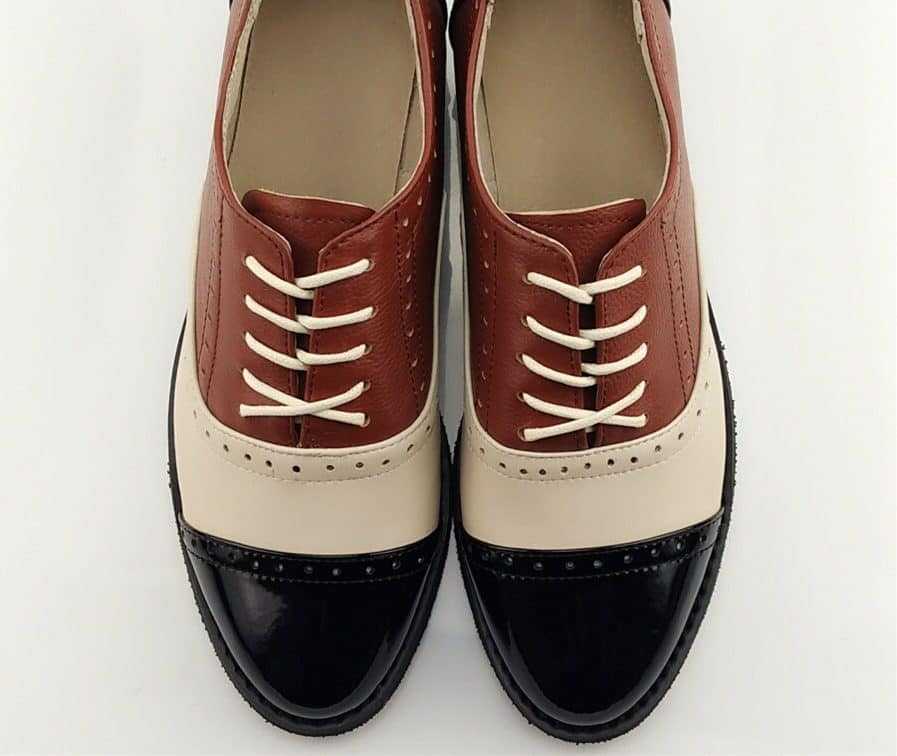 Двухцветная зашнурованная обувь смотрится необычно и нарядно.
