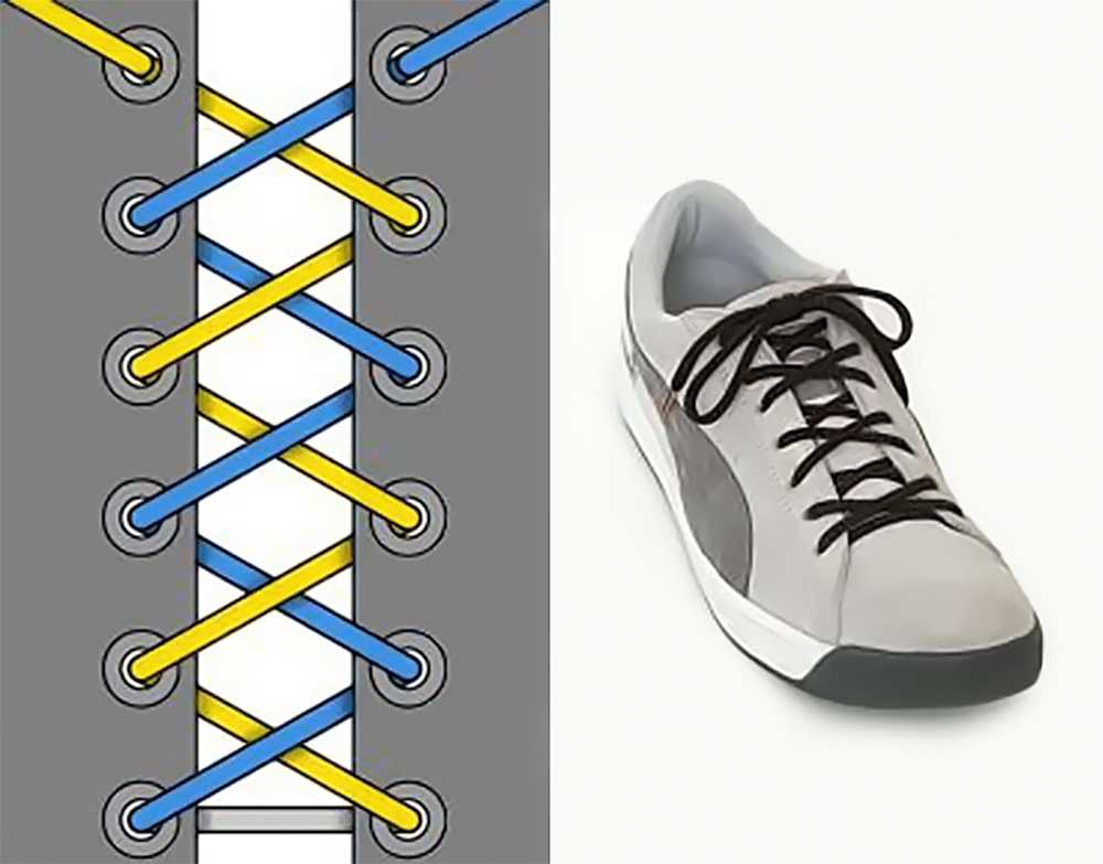 Наиболее распространенный метод шнуровки обуви — перекрестный. При желании можно выбрать любой другой способ, базовые правила будут идентичными: