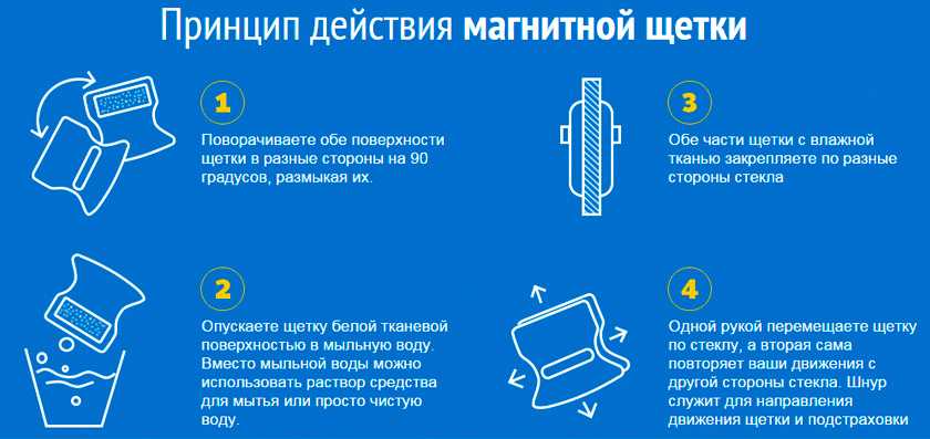 По сути, это даже две щетки, которые оснащены магнитом и притягиваются друг к другу.Вы наносите моющее средство на обе стороны стекла, затем размещаете одну половину девайса на внешней стороне, вторую — на внутренней, после чего водите щеткой по внутренней стороне. Вторая часть следует за движением первой – и вы одновременно вымоете обе стороны стекла. Внешнюю щетку для безопасности можно закрепить с помощью страховочного тросика.