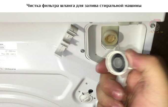 Заливной фильтр располагается на задней панели стиральной машины и защищает ее от мусора из водопровода. Для его очистки необходимо перекрыть воду, открутить шланг и изъять фильтр-сеточку