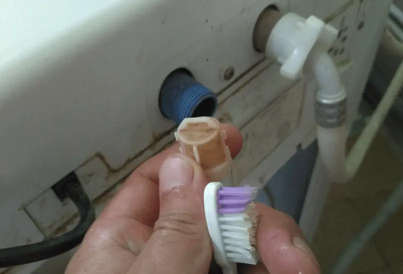 Дальше перекрываем холодную воду. На задней стороне машины находим шланг. Откручиваем гайку шланга и достаём из него фильтр с сеткой, можно воспользоваться плоскогубцами, которые вы взяли раньше. А потом чистим фильтр в воде зубной щёткой. Когда будете возвращать фильтр назад, проверьте, чтобы шланг был прикручен надёжно.