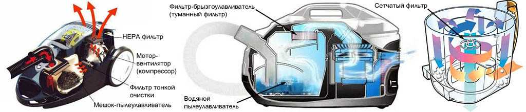 В пылесосе с сухим пылесборником (слева на рис.) воздух проходит сначала через мешок-пылеулавливатель, затем через фильтр тонкой очистки и отсек мотор-вентилятора. Т. наз. HEPA-фильтр задерживает частицы размером порядка 1 мкм. HEPA-фильтр работает только под напором, а пылинки менее 3-5 мкм на работу и долговечность мотора не влияют, поэтому HEPA-фильтр ставят после мотор-вентилятора, который в данном случае работает и как компрессор.