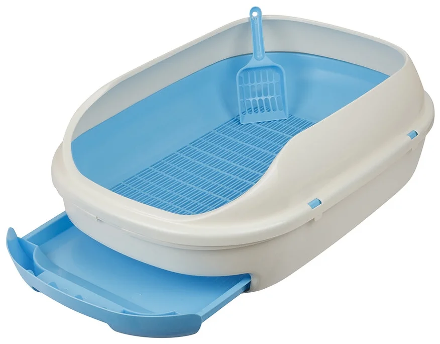 Высококачественный лоток с высоким бортиком. Он рекомендован к использованию для тех питомцев, которые ходят в туалет мимо контейнера или разбрасывают наполнитель по сторонам. В комплект к изделию прилагается совок. Он облегчает уход за приспособлением. На таком лотке можно зафиксировать мешок. Его кладут на дно контейнера, а края фиксируют бортиком.