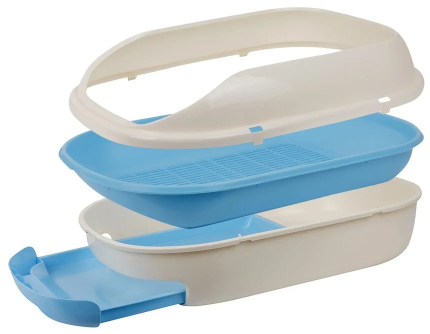Внутри домика предусмотрено место для наполнителя, это может быть вкладной открытый лоточек с сеткой или без неё. Верхняя крышка снимается для удобства уборки и мытья, к нижнему поддону она крепится с помощью специальных клипс. Имеется ручка для транспортировки.