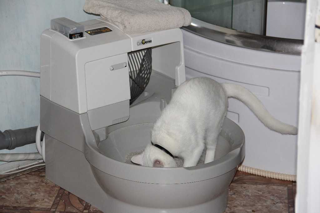 Самый популярный автоматический туалет для кошек со сливом в канализацию называется «CatGenie 120» и представляет собой круглый унитаз со специальным моющимся наполнителем. Жидкость смывается в канализацию сразу после похода питомца в туалет, а фекалии сначала собираются совком с отверстиями и измельчаются, а затем убираются. Далее унитаз и гранулы промываются мыльным раствором и высушиваются под струями теплого воздуха. Цена этой системы колеблется в пределах 30–35 тыс. руб.