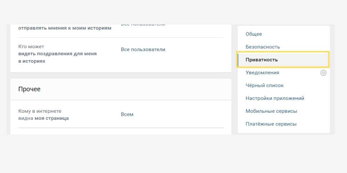 - В открывшемся меню нужно выбрать раздел «Приватность».