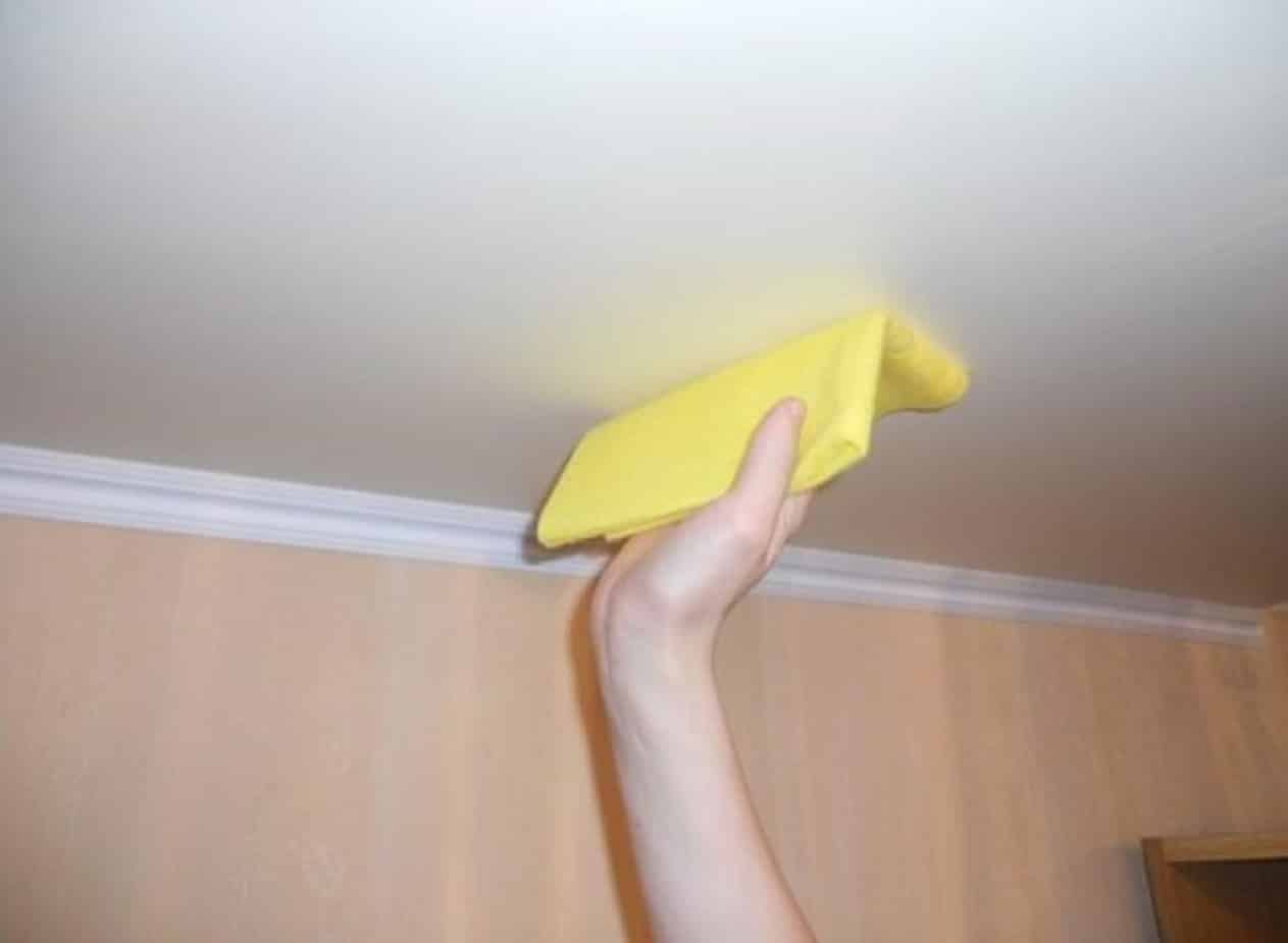 Самый непростой случай, учитывая деликатность декоративного полотна. Во время удаления пятен от краски здесь запрещается использовать механические и химические средства. Единственный вариант – мыльная вода (благо ПВХ пленки не впитывают краску). С тканевыми натяжными потолками все гораздо сложнее: если простая вода с мылом не поможет, покрытие придется менять.