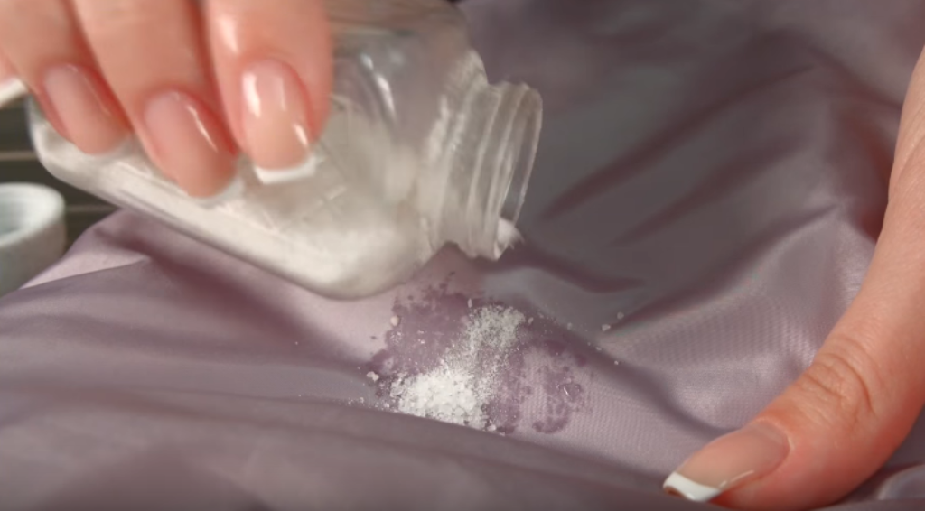 Соль помогает вывести жировое пятно, оставшееся на ткани. Достаточно расстелить вещь на плоской поверхности, подложить под ткань с загрязнением плотную подложку из картона или фольги и посыпать солью на пятно. Через некоторое время стирайте изделие со стиральным порошком.