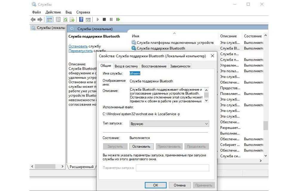 Служба поддержки Bluetooth помогает обнаружить и согласовать удаленные устройства. Ее остановка или отключение приводит к сбою в работе блютуза. Необходимо запустить Диспетчер служб: