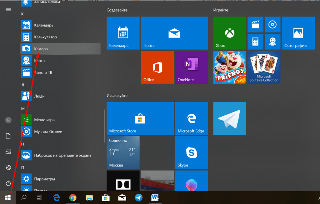 Как открыть камеру на ноутбуке с ОС Windows 10? Нужно выполнить следующую серию последовательных действий:
