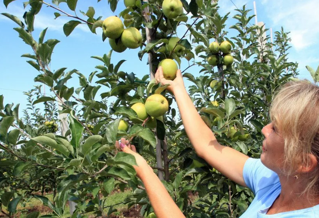 В первую очередь обрывают яблоки с нижних веток, постепенно двигаясь к макушке.