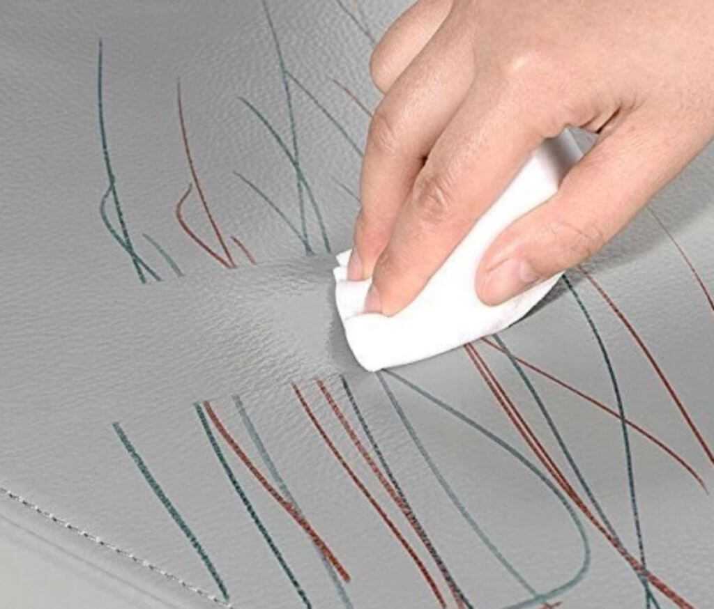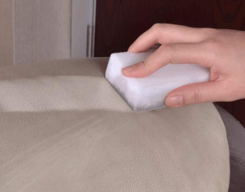Обувь, сумки и мягкая мебель из светлой гладкой кожи отлично оттирается влажной меламиновой губочкой. Светлый кожаный диван будет как новый.