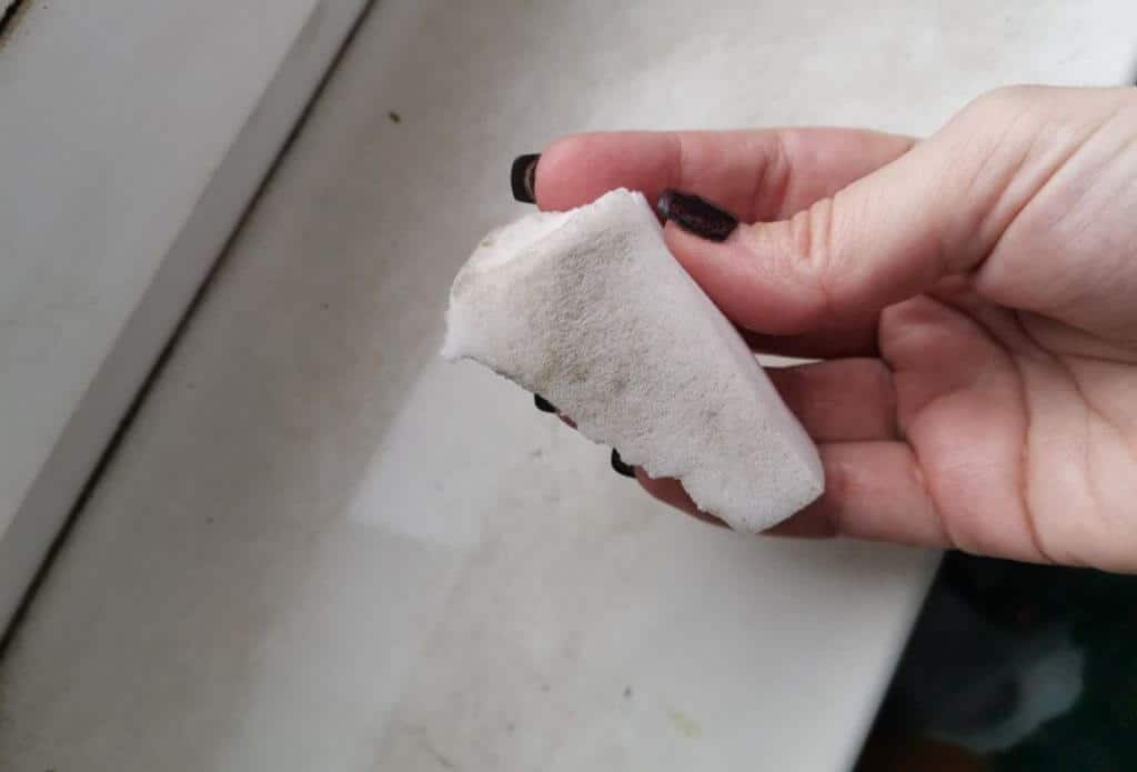- Для начала нужно объективно оценить размер купленной меламиновой мочалки. Если она кажется слишком большой, следует разрезать её на несколько частей с помощью ножика или ножниц.
