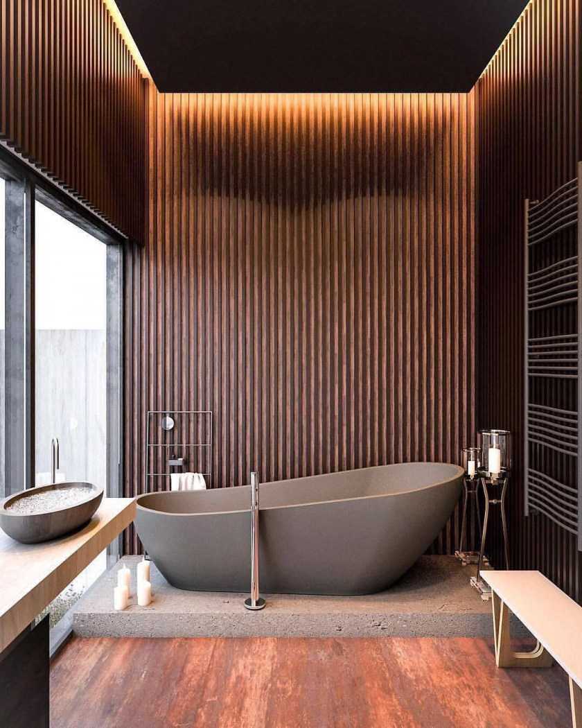 Удлиненные ванные комнаты позволяют иметь реализовывать оригинальные решения по размещению различных приборов.