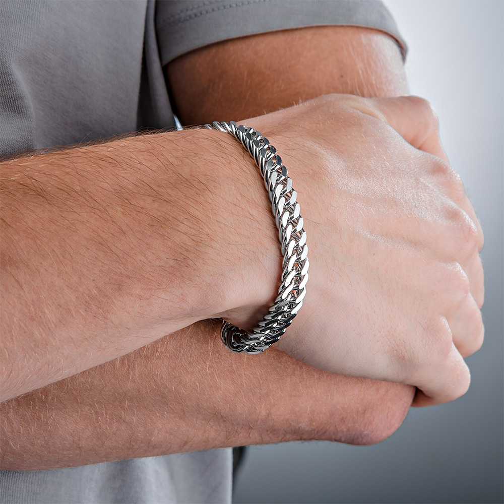 Одни из самых популярных — серебряные браслеты. Они хороши и для молодых парней, и для солидных мужчин. К тому же человек с таким украшением комфортно чувствует себя и в офисе с деловыми партнерами, и на романтическом свидании в ресторане, и на встрече с друзьями в неформальной обстановке. Это украшение не вступает в противоречие ни с деловым костюмом, ни с джинсами и рубашкой, поскольку выглядит довольно строго, что позволяет подчеркнуть мужественность. Состоявшиеся мужчины, к примеру, занятые в сфере бизнеса, могут выбрать массивный браслет в классическом стиле, подчеркивая тем самым свой статус. Для юношей больше подойдут тонкие украшения с причудливым плетением.