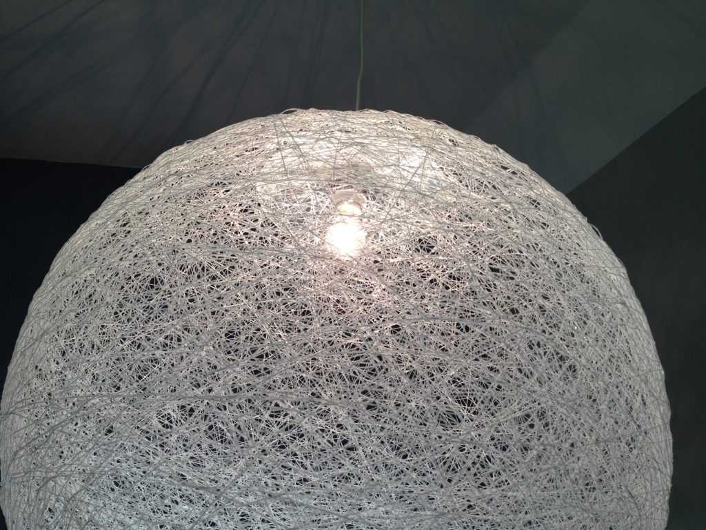 - Надувной шарик и бечевка. Бечевку пропитывают смесью воды, крахмала и клея ПВА. Ею обматывают надутый шар, располагая витки в произвольной форме, и дают высохнуть. Затем из шарика выпускают воздух и аккуратно отделяют его от высохшего шнура. Полученный абажур можно оставить белым или покрасить акриловыми красками.