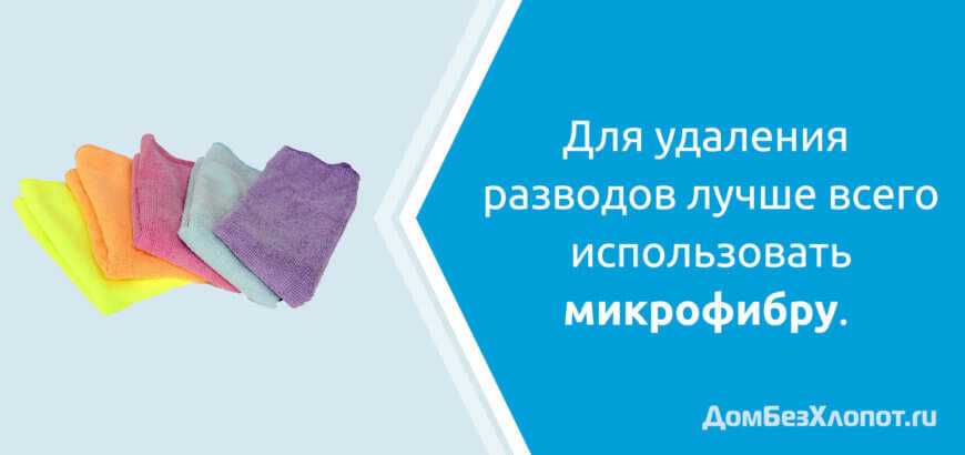 Возьмите салфетку из микрофибры и пульверизаторс чистой водой. Хорошо смочите места разводов и протрите салфеткой.
