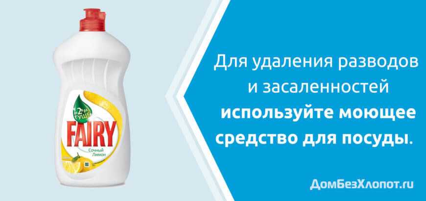 - жидкость для мытья посуды. Нанести его на развод, вспенить, затем стереть салфеткой. Второй рецепт: чайную ложку средства разбавить в стакане воды. Обмочив в ней тряпочку, протереть. Сполоснуть загрязненный участок;