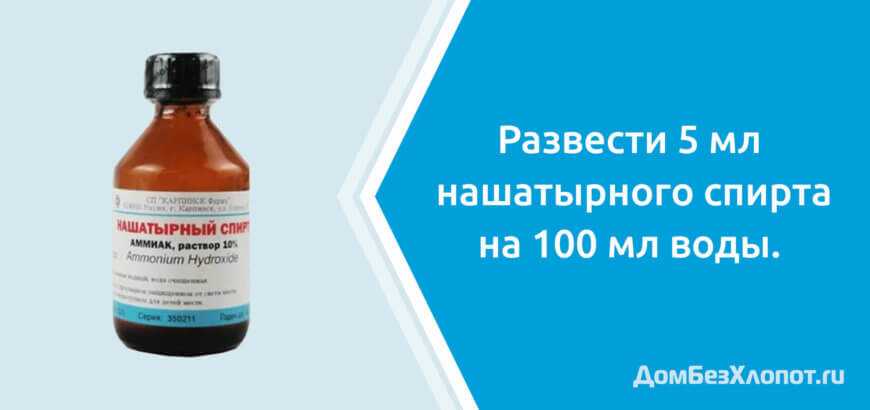 - Развести аммиак в воде. Достаточно 5 мл на 100 мл воды. С его помощью удалить можно белые разводы.