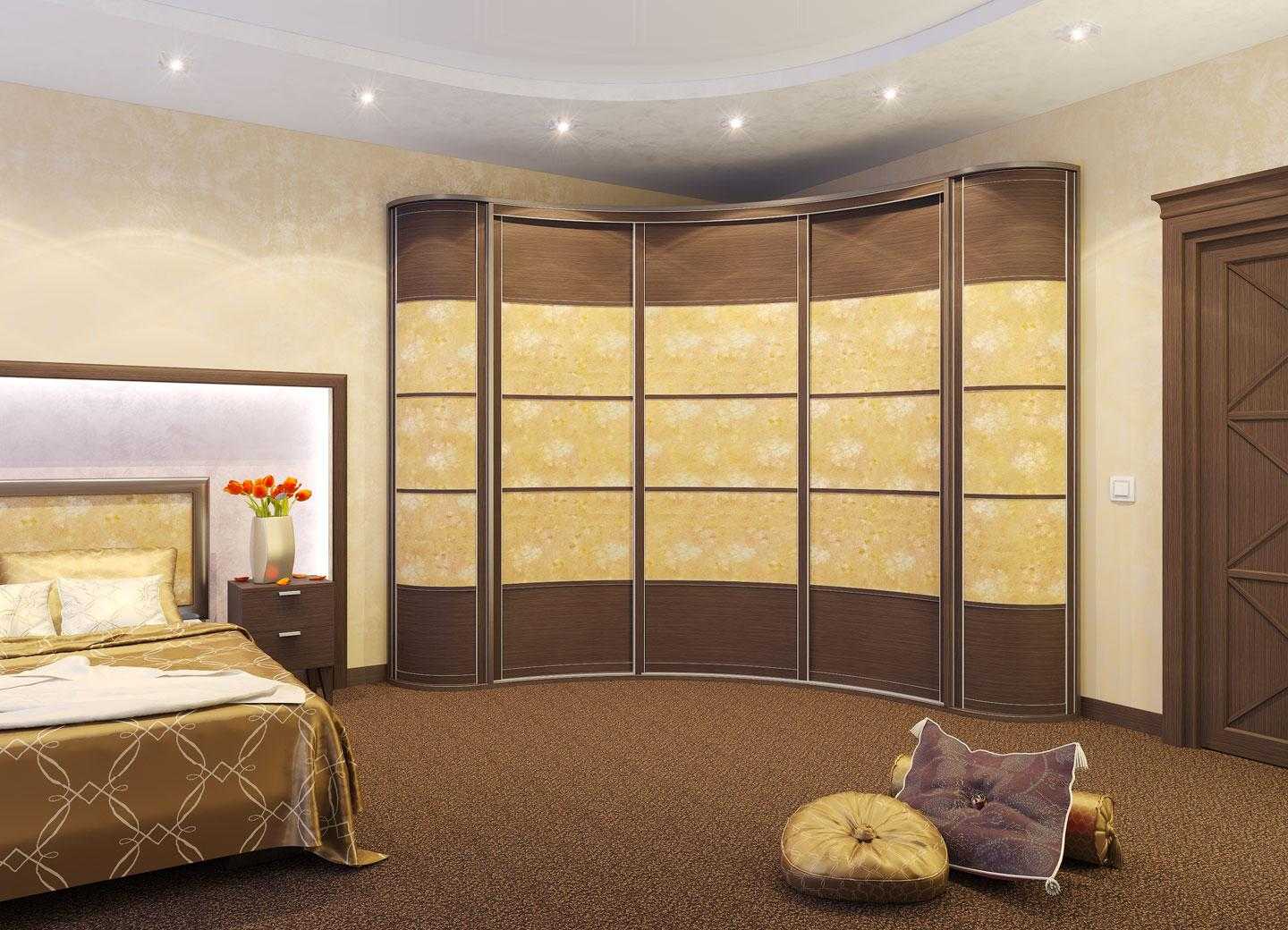 Поэтому по цвету и стилю он должен идеально сочетаться с остальной мебелью. Радиальная мебель успешно замещает гардеробную. Если комната просторная, допустимо использование цилиндрической модели. У кровати отлично смотрится шкаф, повторяющий изогнутую форму изголовья.