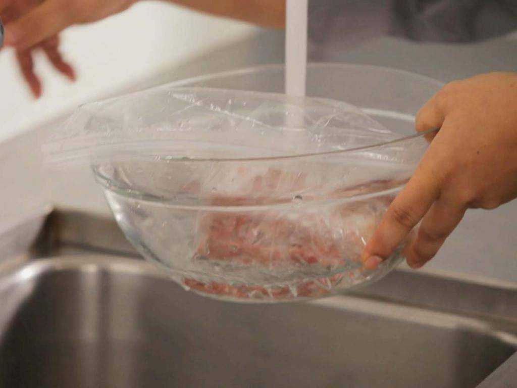 Замороженное мясо нужно поместить под проточную холодную воду или в таз с холодной водой.