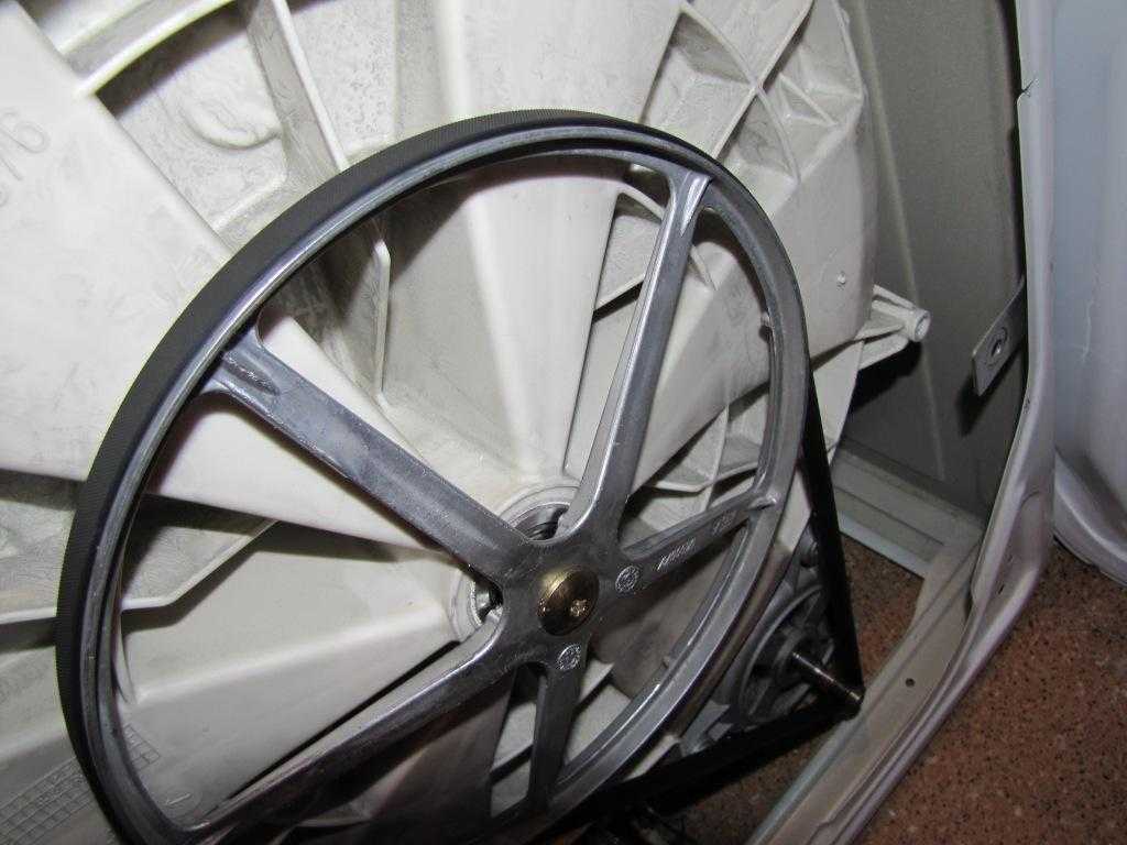 Решить вопрос можно полноценной заменой ремня и шкивов. Для этого достаточно выдвинуть агрегат на открытое пространство и открутить заднюю панель. Откроется вид на задние детали машинки, которые нуждаются в ремонте.
