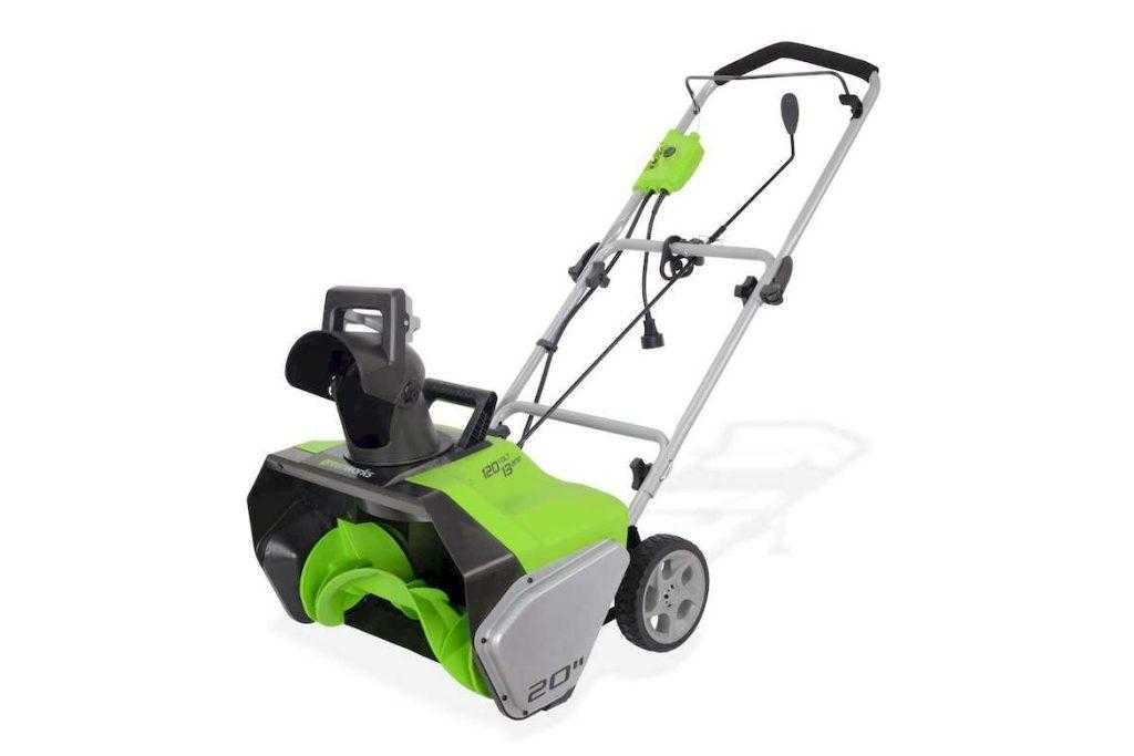 Американская компания greenworks всего за 10 000 рублей предлагает нам очень интересный снегоуборщик, который по производительности способен поспорить со многими более дорогими аналогами. Мощность двигателя составляет 1800 ватт — этого достаточно для очистки двора от рыхлого и сухого снега, который не успел слежаться.