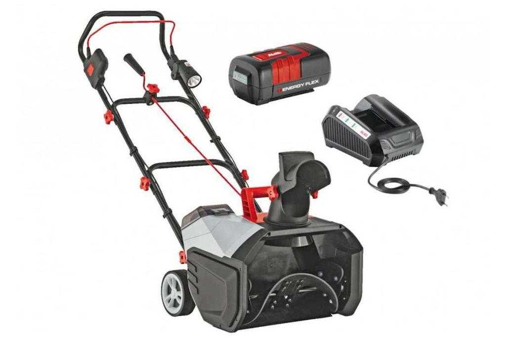 Электрический аккумуляторный снегоуборщик отличается ярким дизайном, но время работы без подзарядки составляет всего 40 минут. Характеристики устройства: