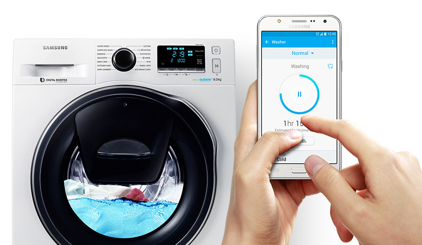 - Samsung Smart Home. Благодаря этой технологии стиральная машинка синхронизируется со смартфоном или ноутбуком. Это позволяет управлять прибором удаленно.