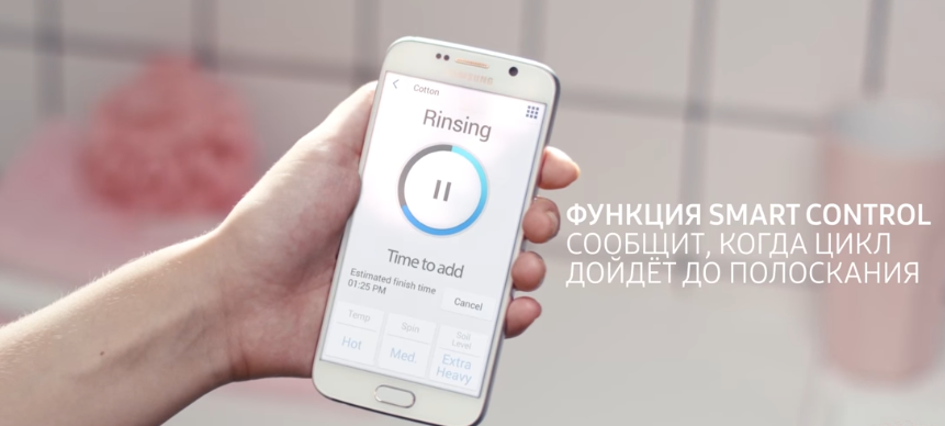 Функцией Smart Control компания Samsung решила облегчить быт современной домохозяйки. Ведь теперь, любой обладатель стиральной машины ww8500 AddWash может не быть привязан к самой стиральной машине. Отныне вся панель управления стиральной машиной будет находиться в Вашем смартфоне.