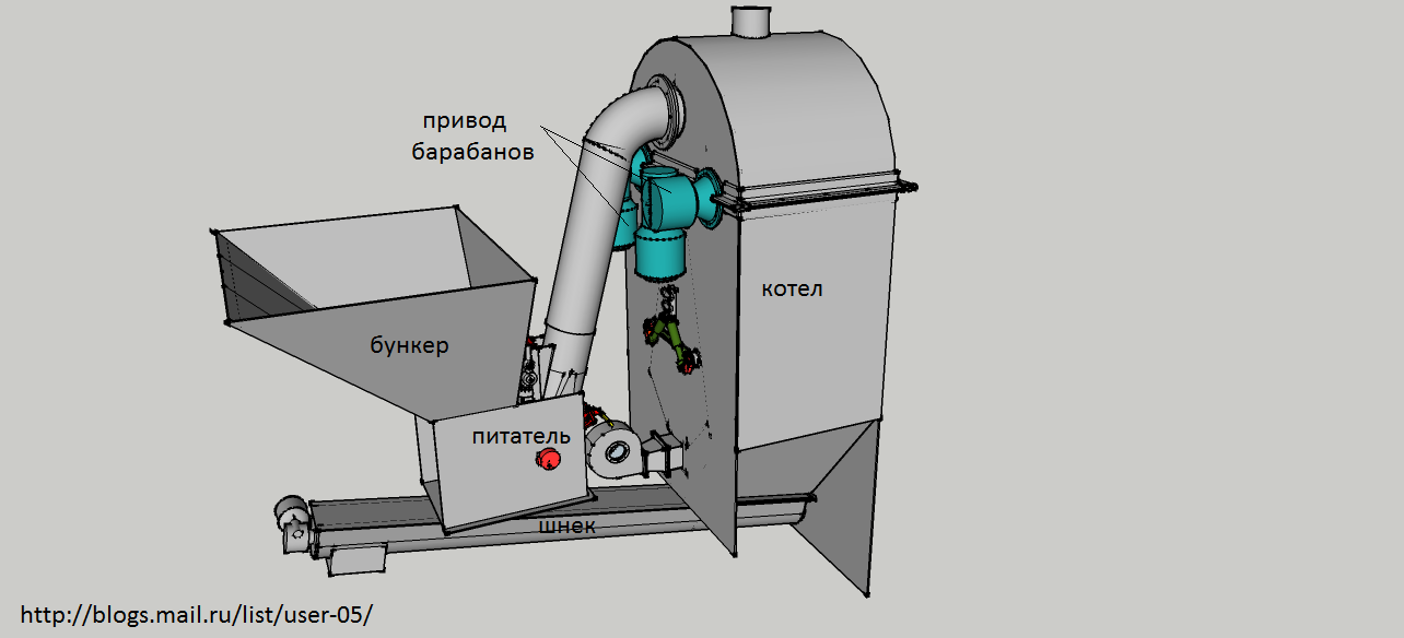 Вращающийся барабан может быть изготовлен из обыкновенной металлической бочки с лопастями, которые служат барьером для проходящего горячего воздуха.