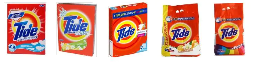 Стиральный порошок Tide выпускается как для машинной, так и для ручной стирки. Он выпускается в упаковках по 450, 900 и 2400 г. У потребителя есть возможность выбрать средство для белых, цветных и детски вещей, а также определиься с наиболее приятным для себя ароматом: лимон, подснежник, альпийская свежесть, белые облака.