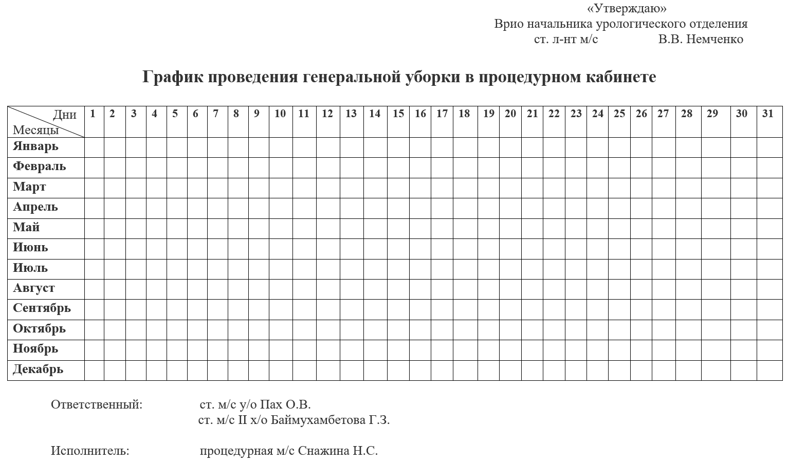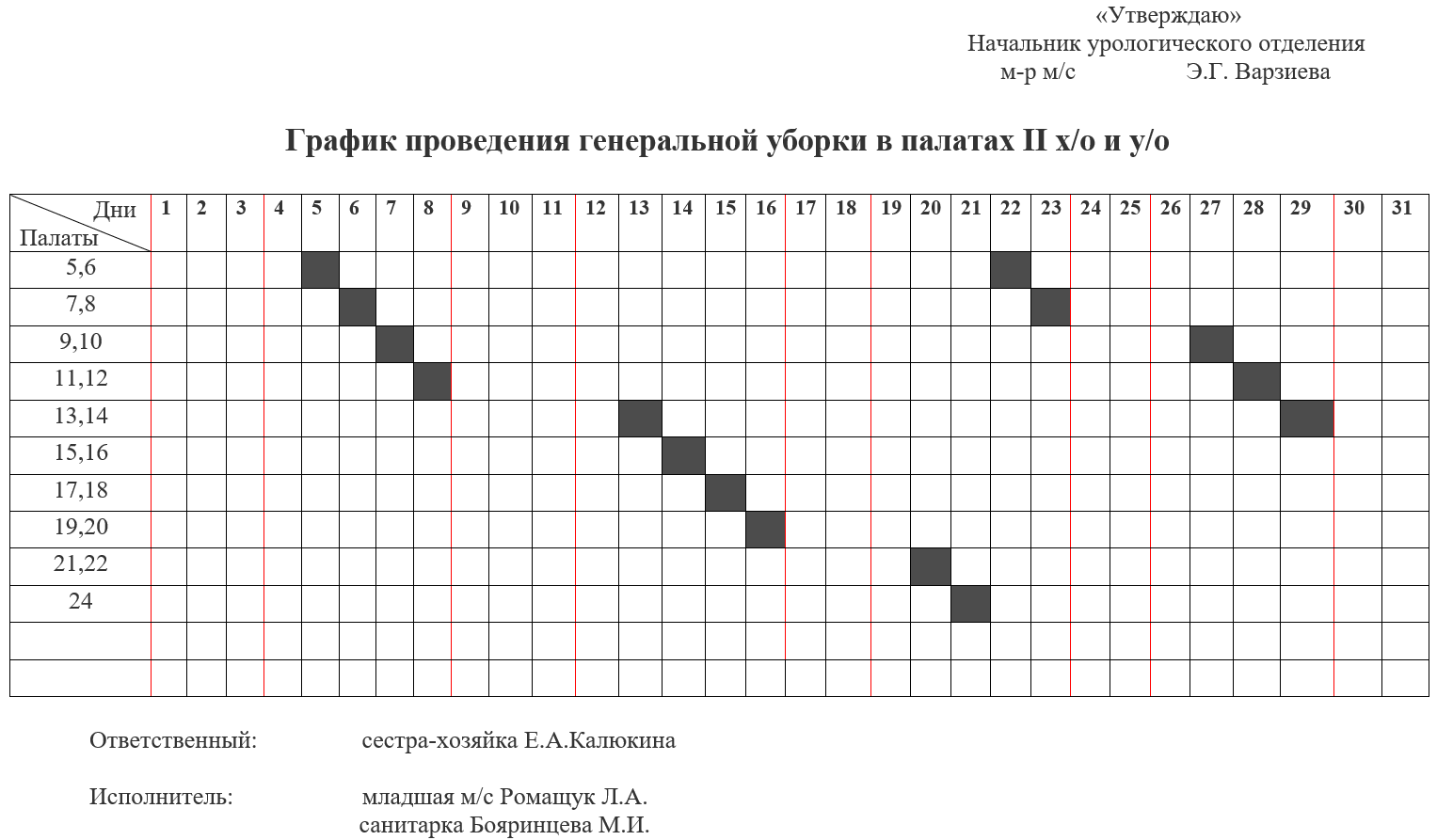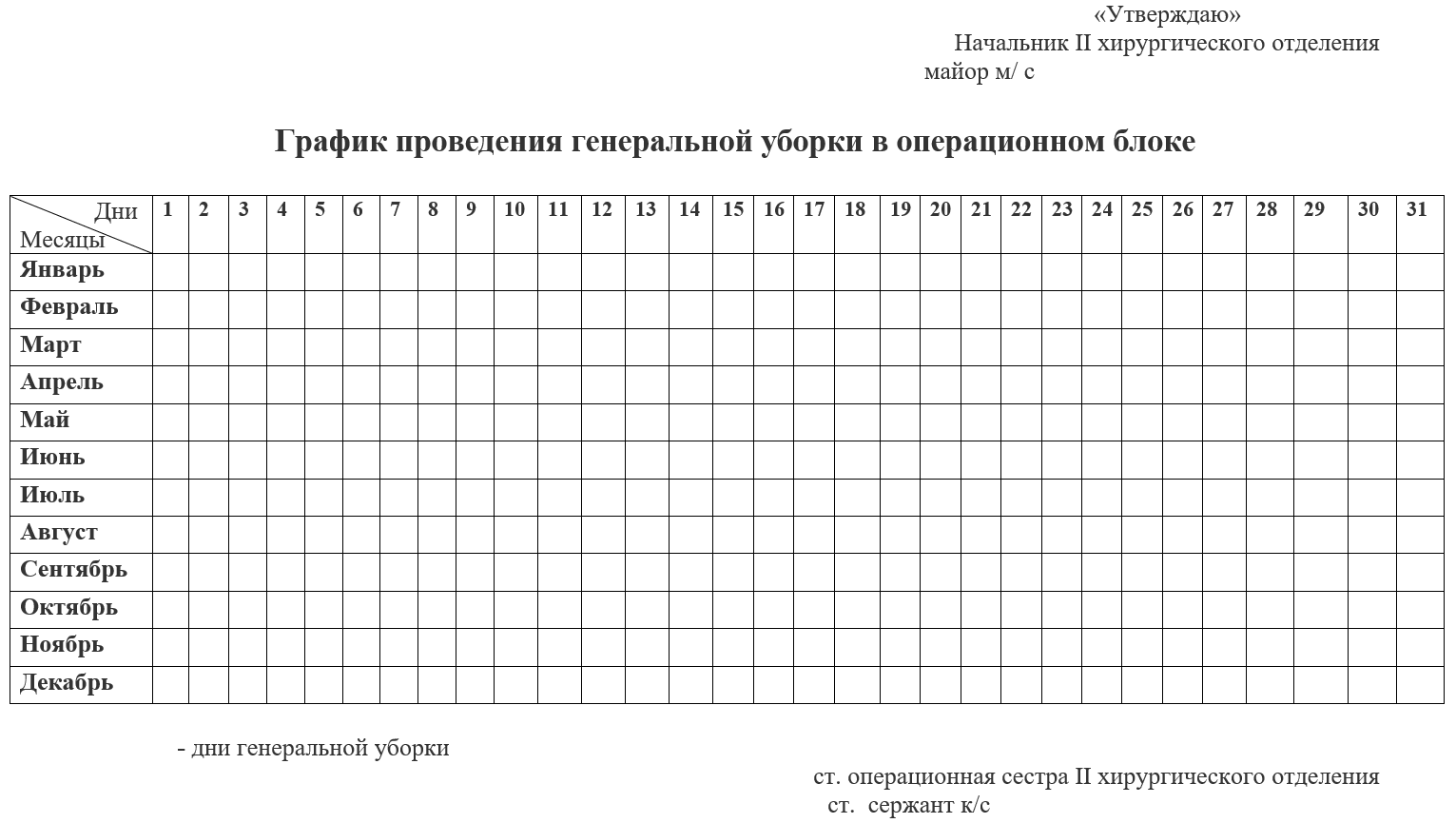 Предлагаем ознакомиться с графиками генеральной уборки в ЛПУ (операционный блок, процедурный кабинет, палаты):
