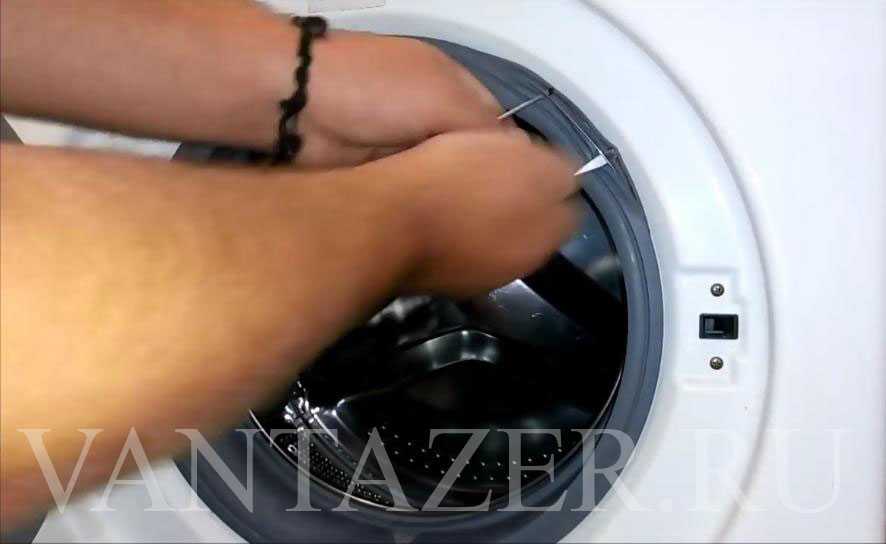 Чтобы снять уплотнительную резину люка, отогните ее край. За ней находится хомут. Он может быть пластиковым — в таком случае разожмите защелки и снимите его. Если хомут металлический, тогда подденьте его плоской отверткой и снимите.