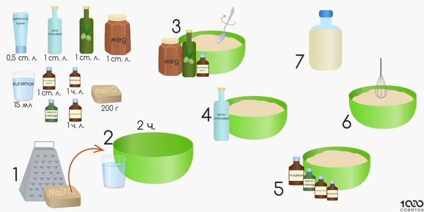 | 1 | Натираем на тёрке несколько кусочков мыла, разбавляем водой, ставим на водяную баню | При закипании состава необходимо снимать пену |