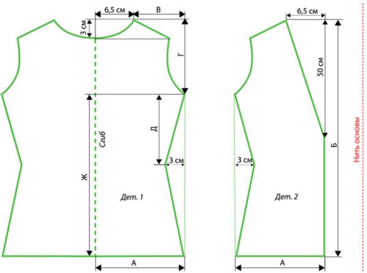Однако учитывайте, что такой крой возможен только в случае равенства объёмов груди и талии с учётом прибавок на свободное облегание.