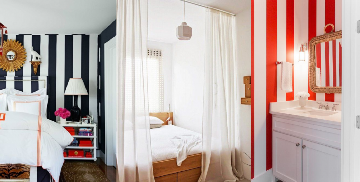 Горизонтальные полосы визуально делают комнату шире, но могут и «снизить» потолок. Если он и так невысокий, откажитесь от такой отделки.