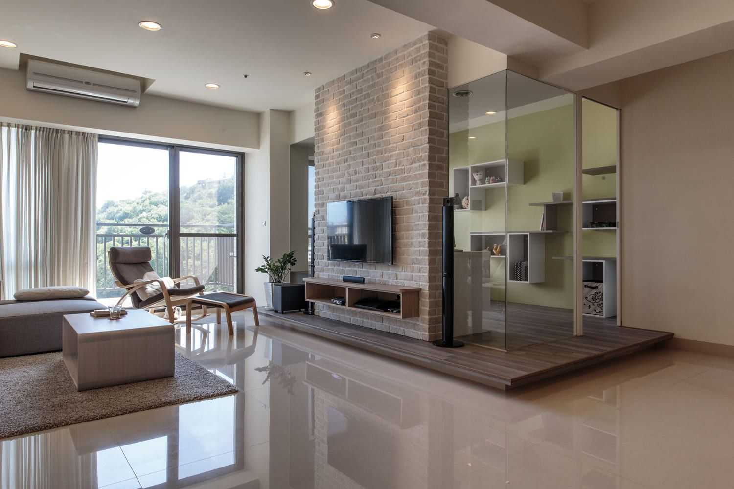 Дизайн стенок-перегородок может быть самым разнообразным и включать в себя застекленные участки любой формы и открытые полочки.