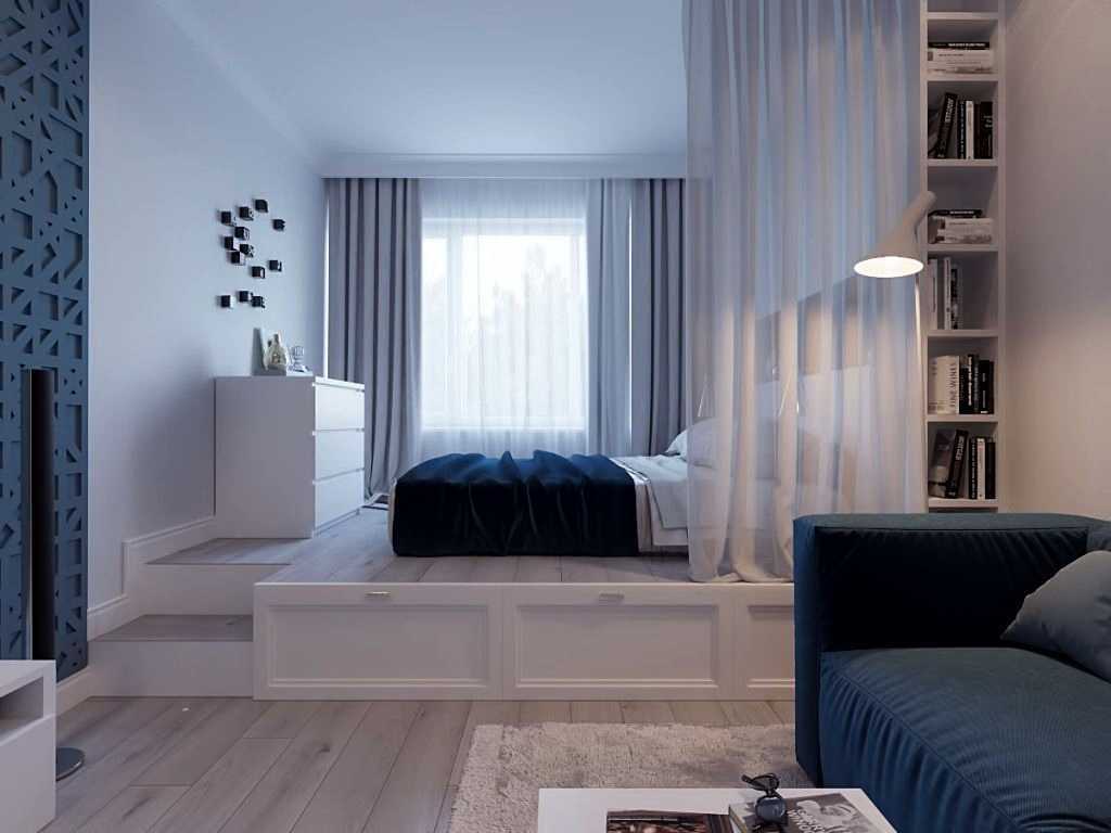 Низкий подиум – небольшое возвышение для кровати. На примере подиум занимает ровно половину комнаты и в него встроены ящики для хранения, также предусмотрена штора, закрывающая спальную зону.