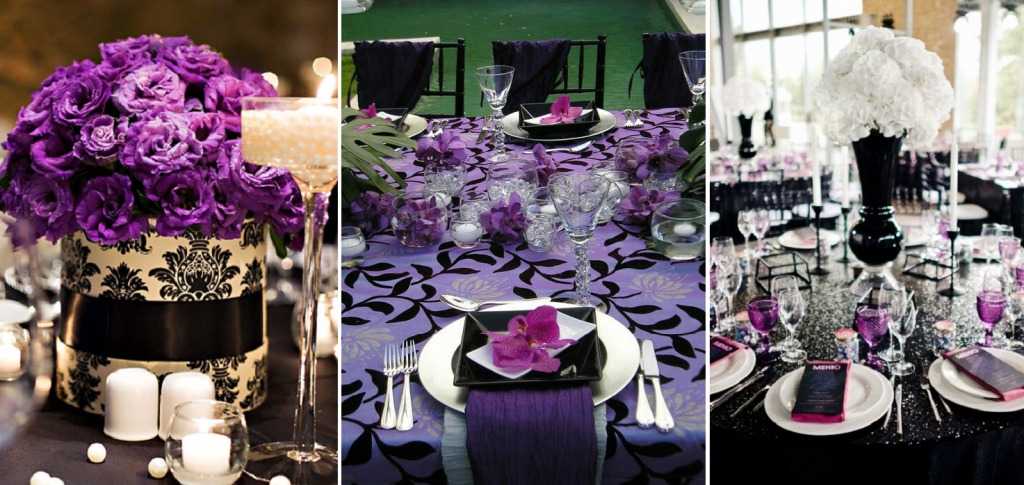 Брутальной обстановки для мужского праздника привнесёт фиолетово-чёрная сервировка стола. Такое сочетание также нередко встречается, когда стол оформляется в стиле арт-деко.