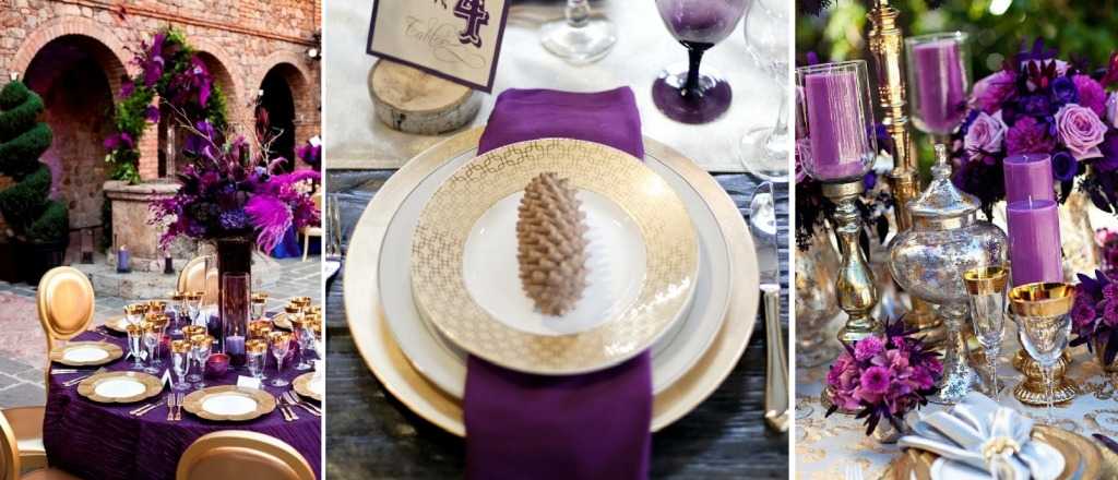 Роскошное сочетание фиолетового, золотого или серебряного создаст богемную обстановку. Осуществить можно, если поставить на стол бокалы и тарелочки с золотой каймой в сочетании с салфетками и скатертью фиолетового оттенка.