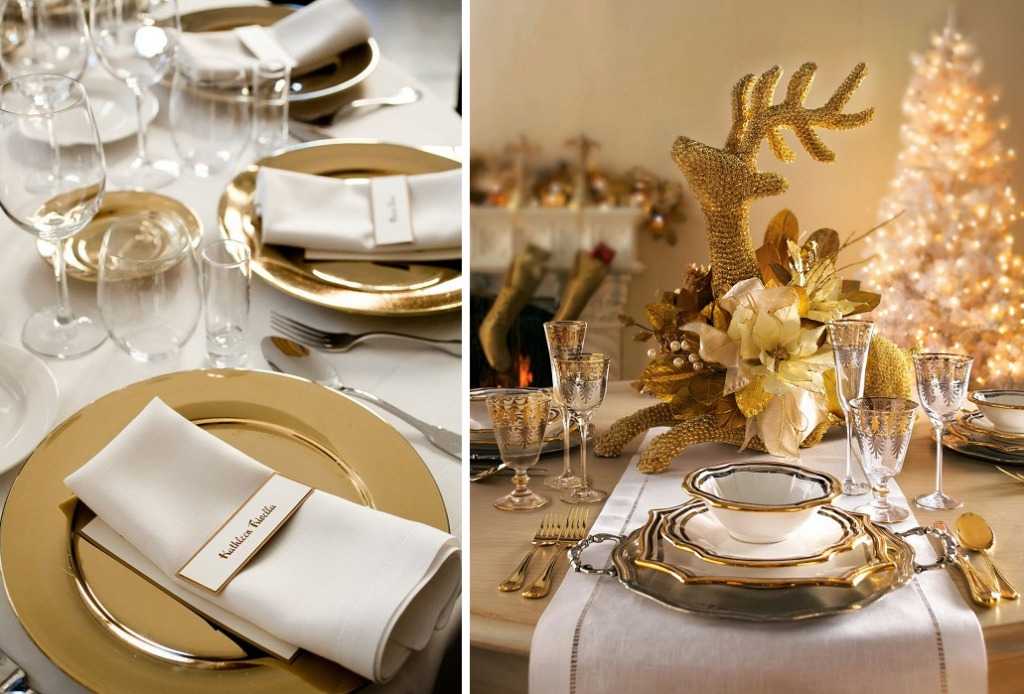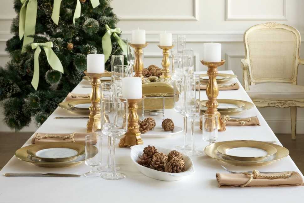 Очень эффектно будут смотреться столовые приборы с позолотой, фарфоровый столовый сервиз с золотой каймой, белоснежная скатерть с кружевами и золотой вышивкой. Если таких предметов в доме нет, не нужно расстраиваться, можно воспользоваться любыми предметами в золотом: вазы, кольца для салфеток. Если взять чисто белую скатерть, то она подчеркнёт аристократизм обстановки.