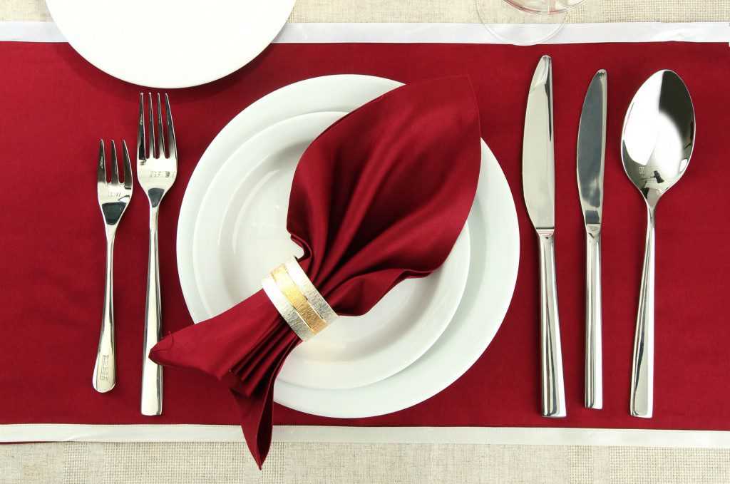На центр тарелки кладется накрахмаленная текстильная салфетка, обвязанная специальным кольцом. Желательно, чтобы декор был контрастным. Будет неплохо смотреться праздничный стол, если использовать алую скатерть, а поверх поставить блестящую посуду. Салфетку укладывают красивыми волнами. Можно подобрать текстиль темных оттенков: фиолетовый, синий, коричневый.