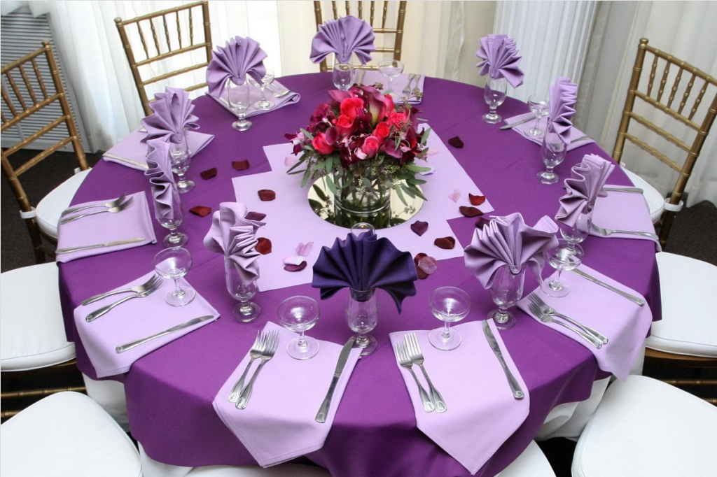 Для любого случая также подойдет оформление в фиолетовых и сиреневых тонах. Чтобы украсить красиво стол, можно обзавестись кольцами или зажимами для салфеток со стразами или камнями. Белоснежную столешницу или скатерть эффектно дополнит атласный текстиль фиолетового цвета. Дополнительный акцент создадут хрустальные индивидуальные бокалы или стаканы, а также серебряные блестящие столовые приборы. Их принято раскладывать по обеим сторонам основной тарелки.