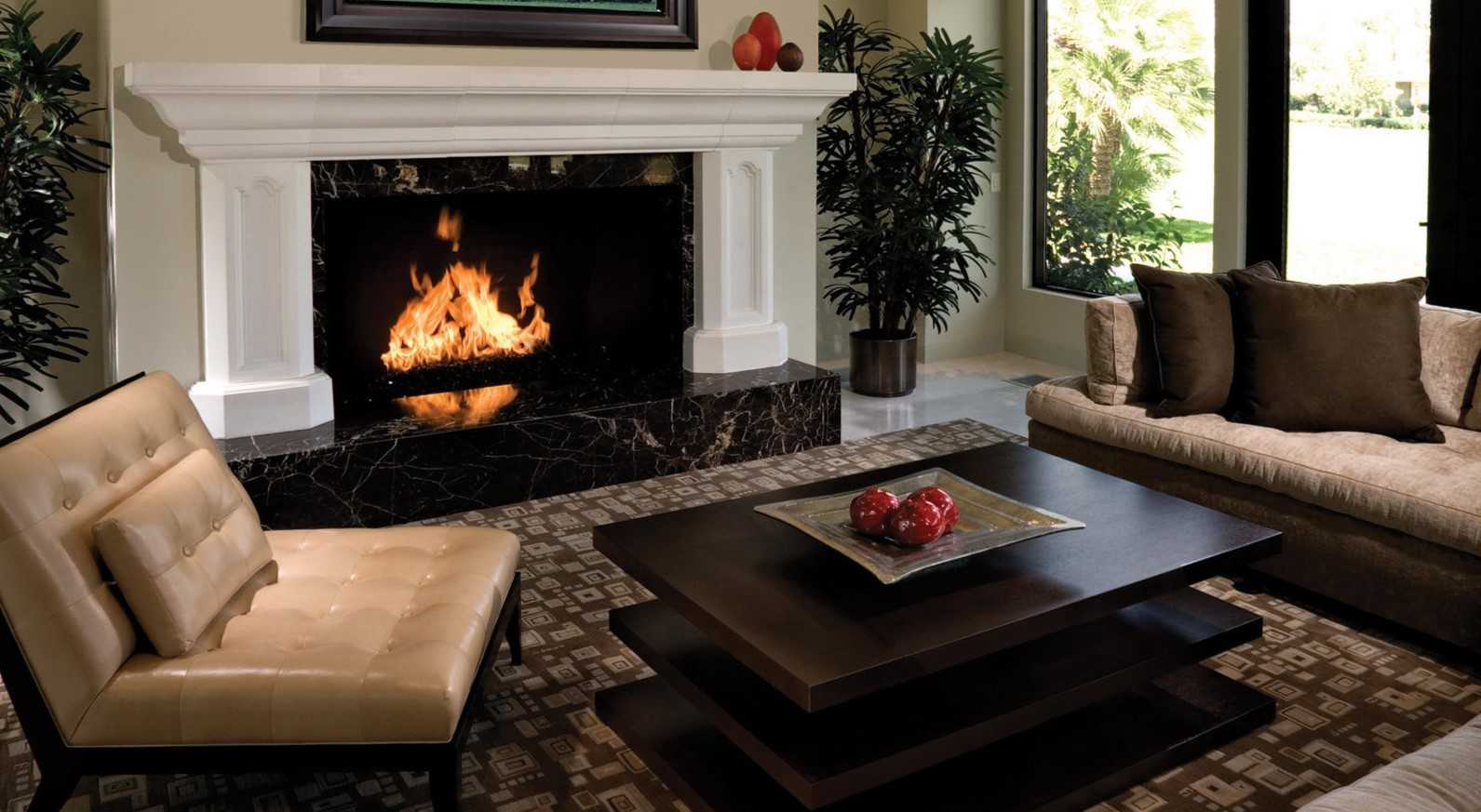 Можно положить на пол темно-коричневый ламинат, а в белом цвете сделать потолок и мебель. Стены лучше выкрасить в охристый цвет. Такой контраст прекрасно подходит для загородного дома. Яркий акцент желательно добавить с помощью бордовой, синей, золотистой посуды в шкафу за стеклянными дверцами. Камин можно отделать белым мрамором.