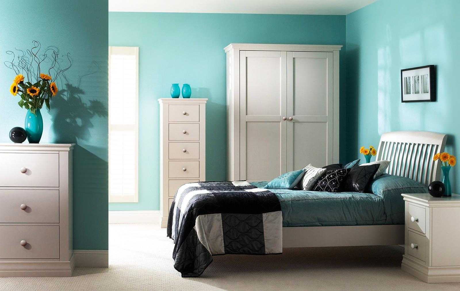 Спальня с нежно-бирюзовыми стенами и белым потолком