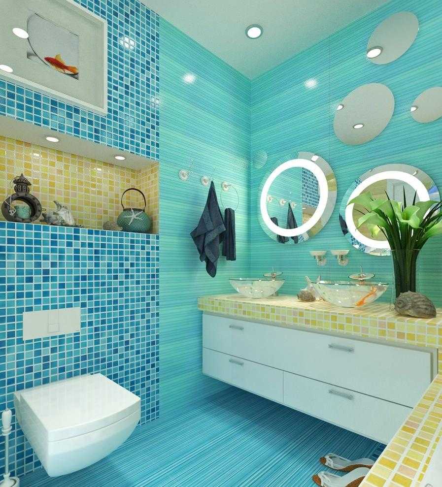 Помогают преобразованию помещения шторы, полотенца, ковры, выполненные из тканей с соответствующим рисунком. Чередующиеся белые и синие полосы — беспроигрышный вариант. Но и смешные дельфины, улыбающиеся киты, пучеглазые рыбки будут уместны, если в семье есть маленькие дети.