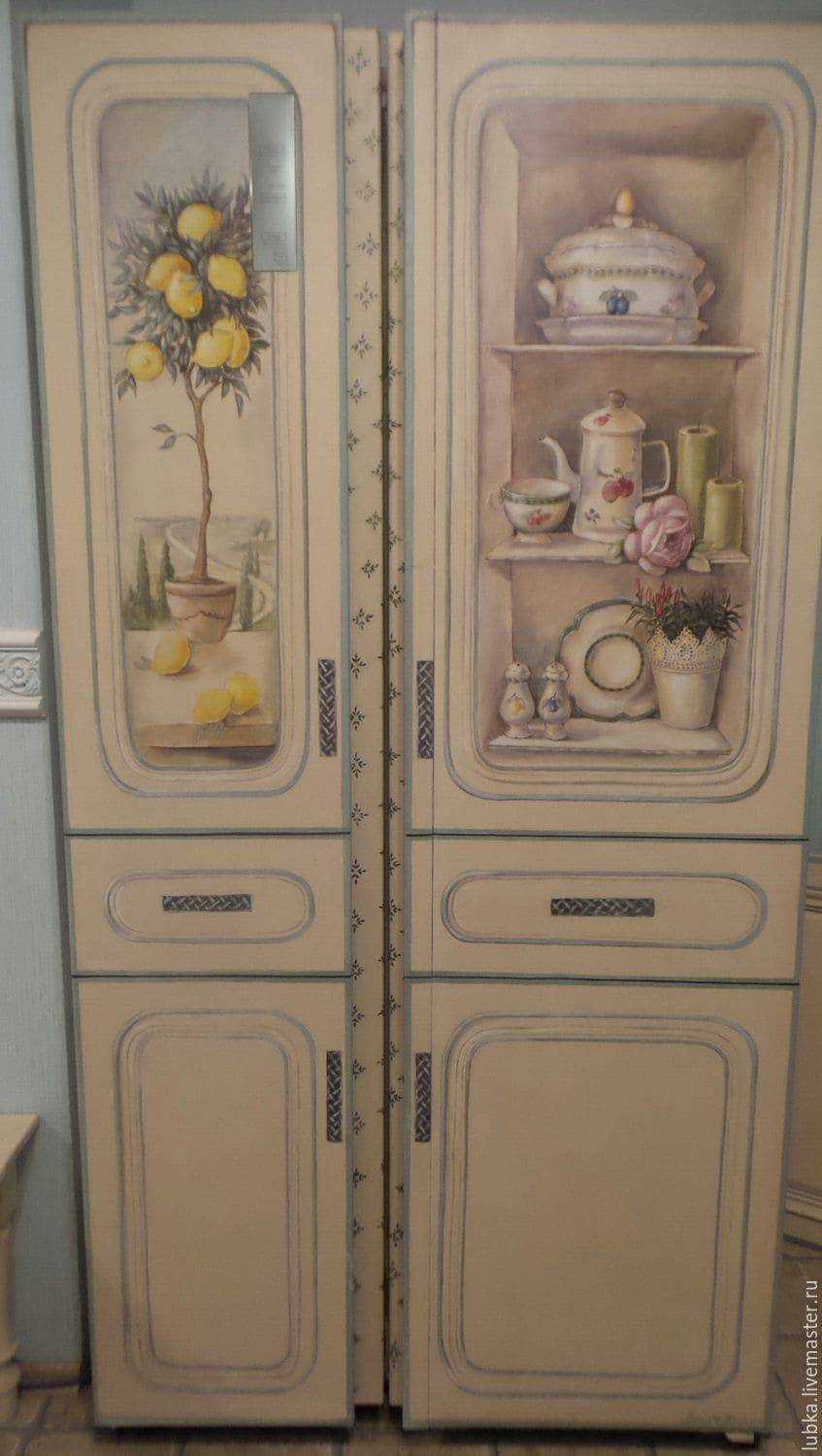 Декупаж – это простой и отличный способ обновить старый холодильник, адаптировать его под интерьер кухни в деревенском или традиционном стиле, дополнить ручную роспись или оформление молдингами. Для тех, кто владеет этой техникой, будет огромным удовольствием заняться таким объектом, как холодильник, ведь там такое поле для творчества!